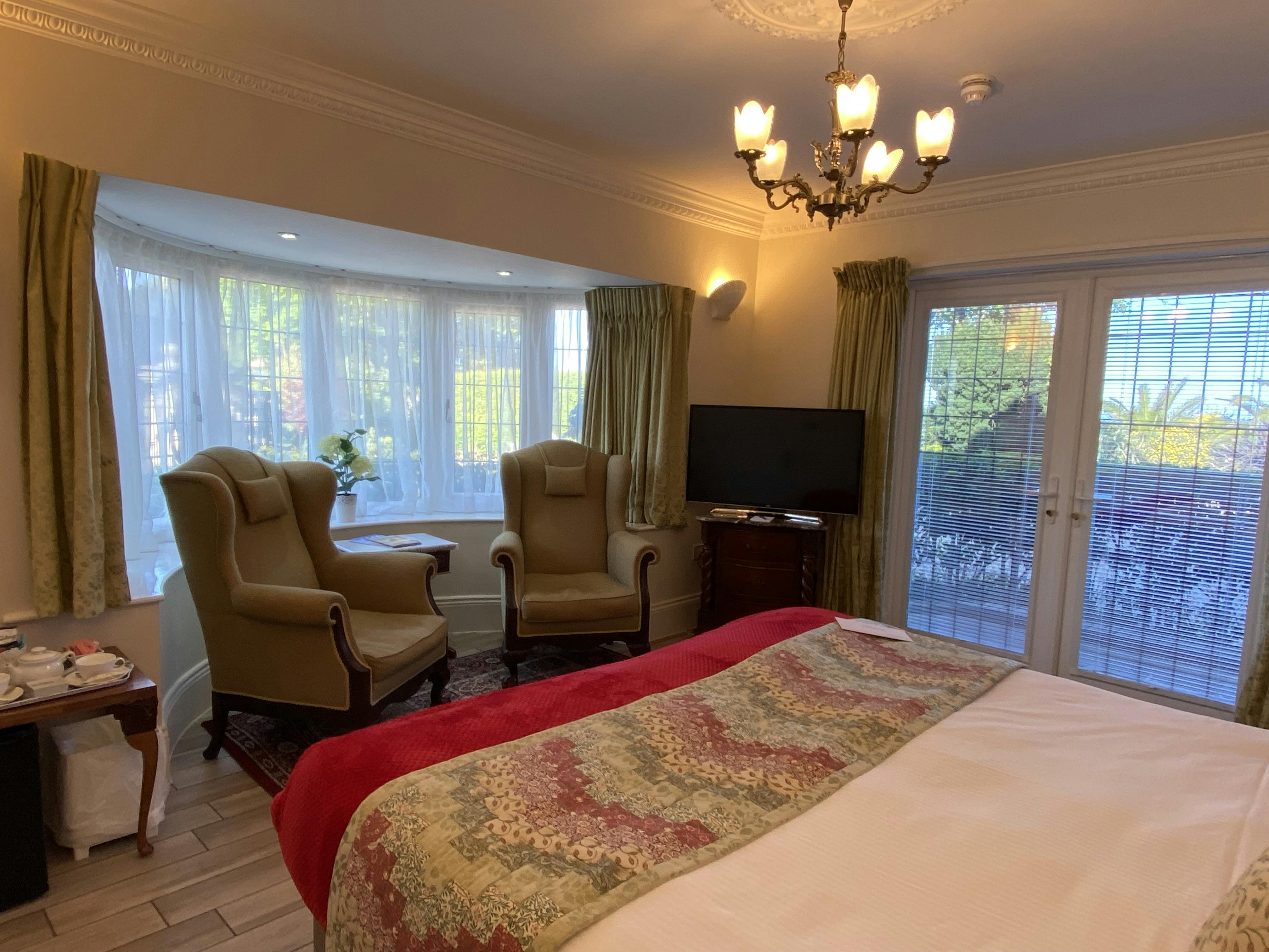 An elegant ground floor bedroom with two French windows plus a huge bay window - both providing good views of the Sea over the gardens. Easy ramp entry (no stairs, but to reach the Main House, you must traverse some gravel), spacious doorways, porcelain tile floors make this bedroom easy to navigate. *Having porcelain flooring, this room welcomes well-behaved dogs. Continental Breakfast included.