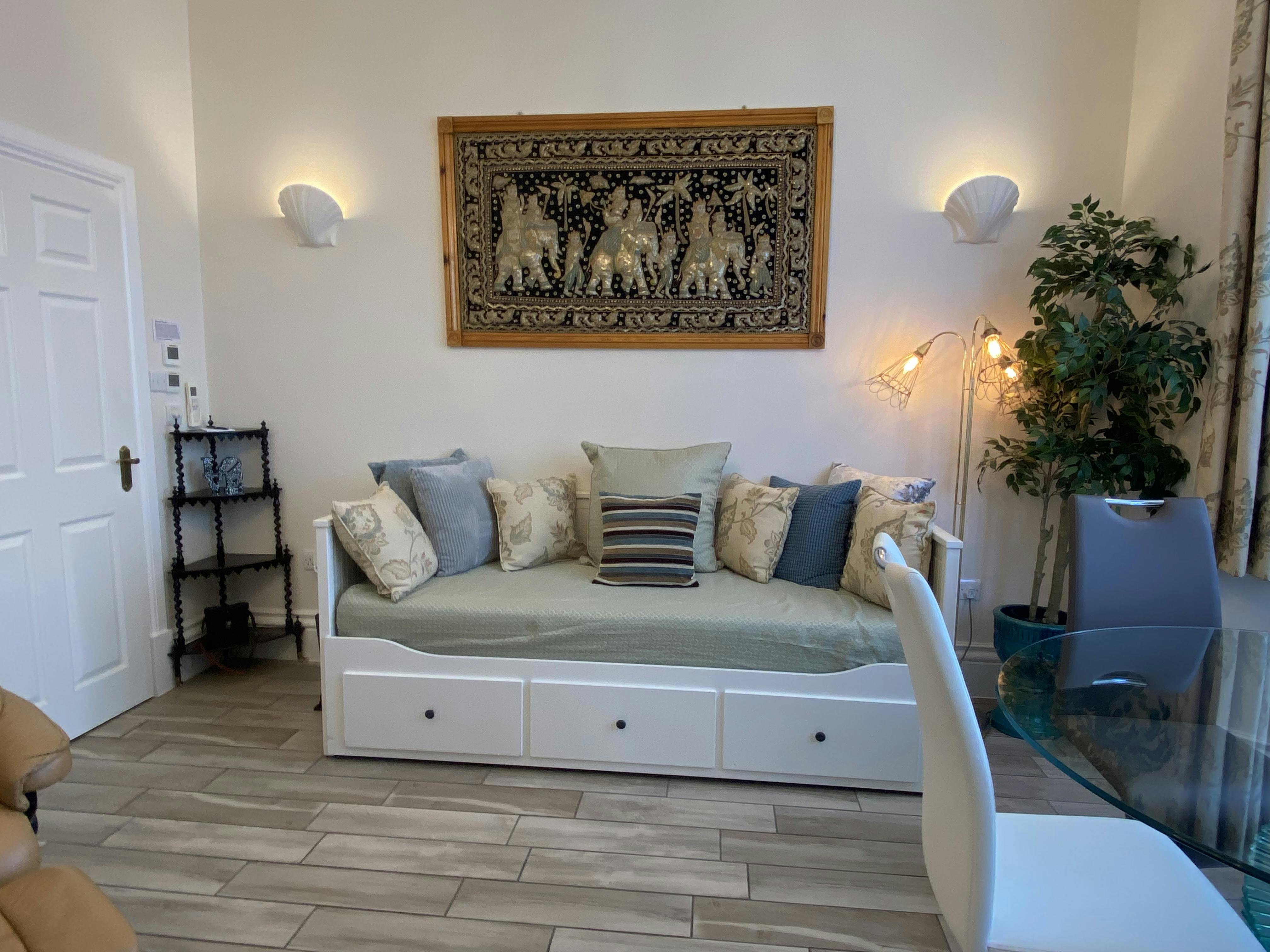 - Large lounge has 2 comfortable chairs, Smart TV, large day bed, marble fireplace with vintage Overmantle mirror and glittering glass chandelier.