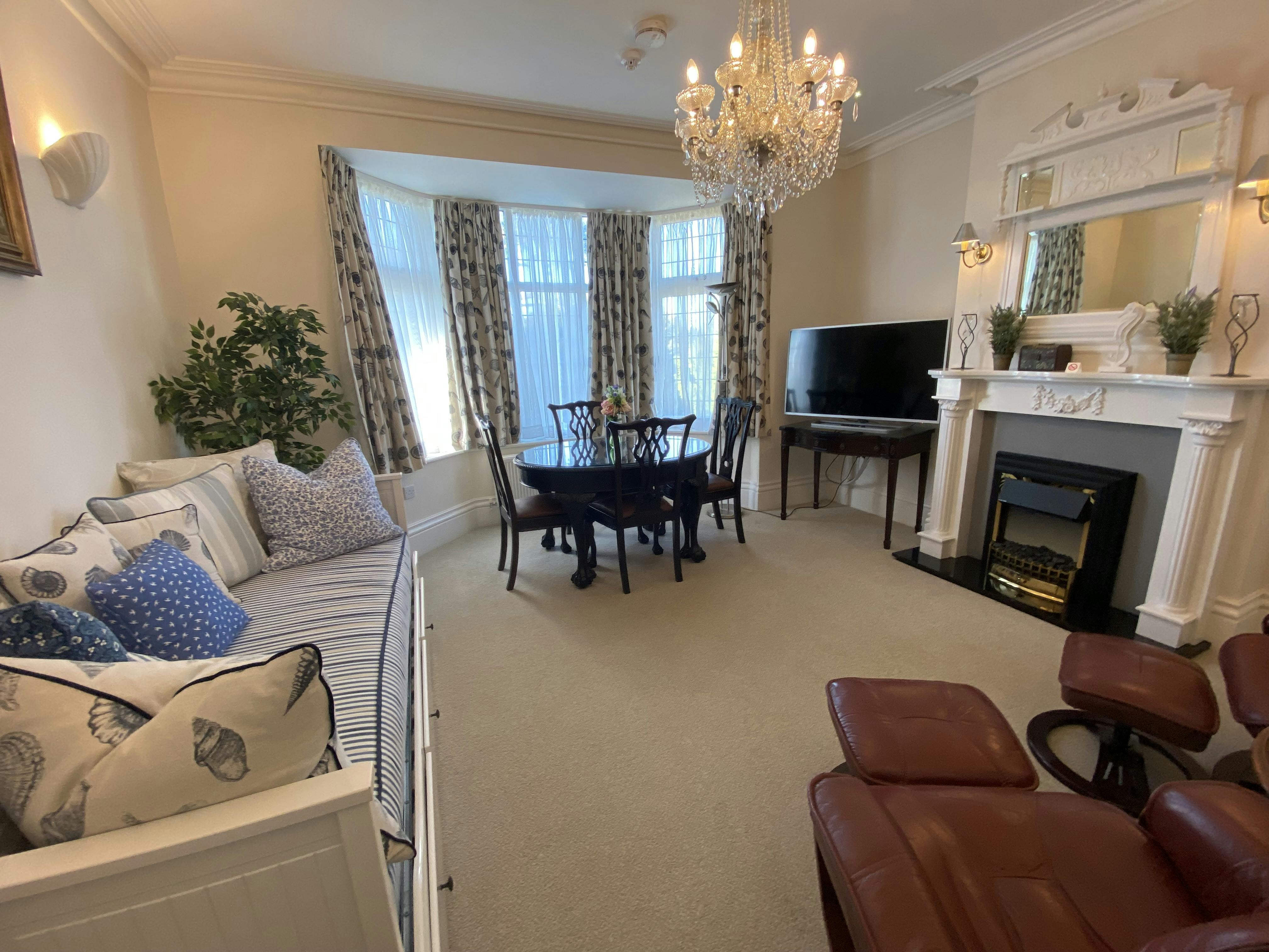 - Large lounge has 2 comfortable chairs, 42" Smart TV, large day bed, marble fireplace with vintage Overmantle mirror and glittering glass chandelier.