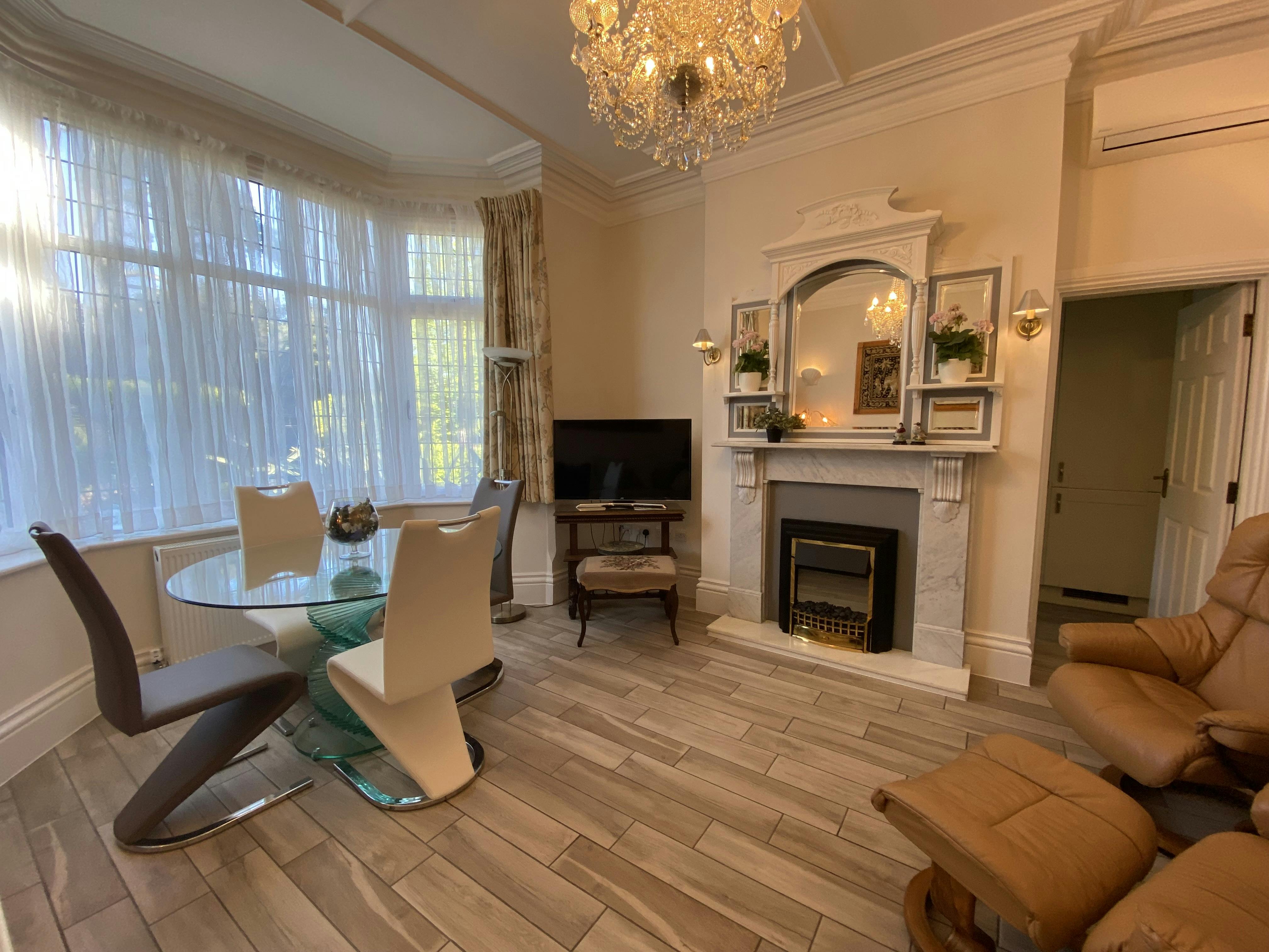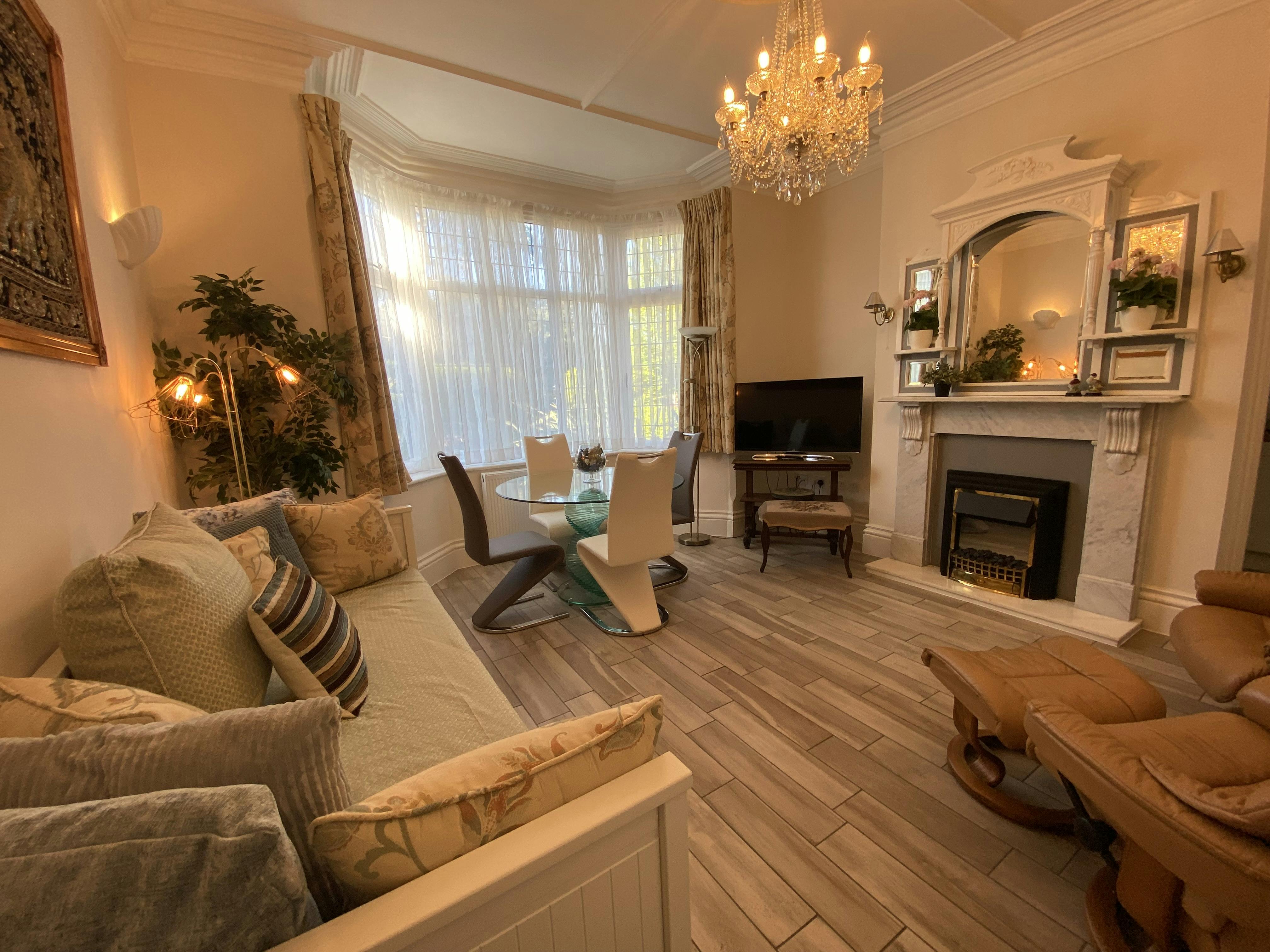 - Large lounge has 2 comfortable chairs, Smart TV, large day bed, marble fireplace with vintage Overmantle mirror and glittering glass chandelier.