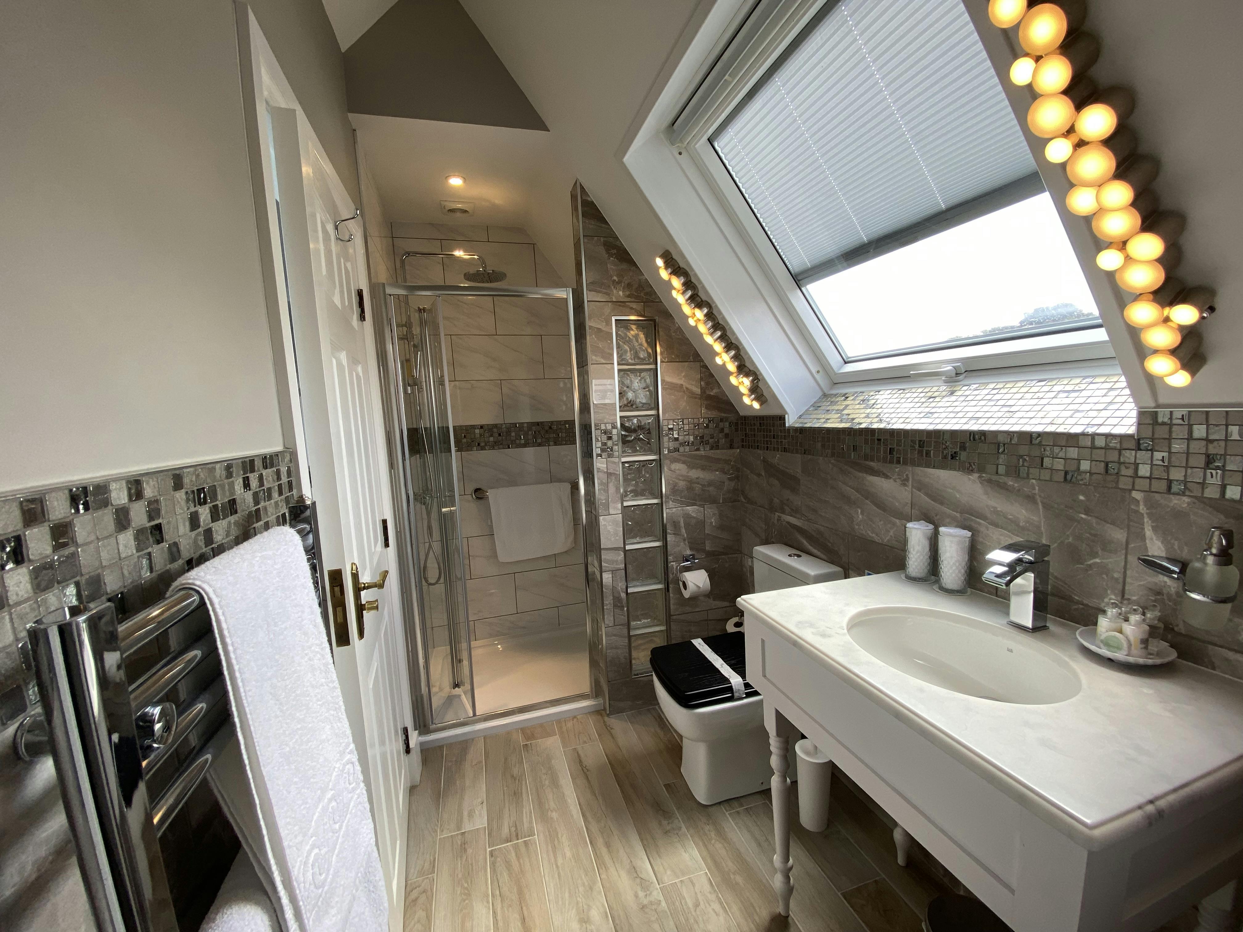- Ensuite marble tiled bathroom with period style washstand basin, large walk-in shower, heated towel rail